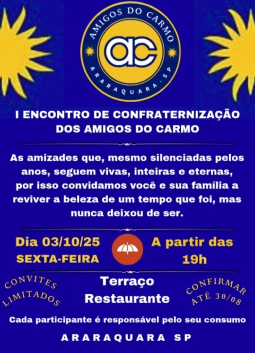 O encontro será no dia 03 de outubro de 2025, sexta feira, às 19h00, no Terraço Restaurante, com grandes surpresas.