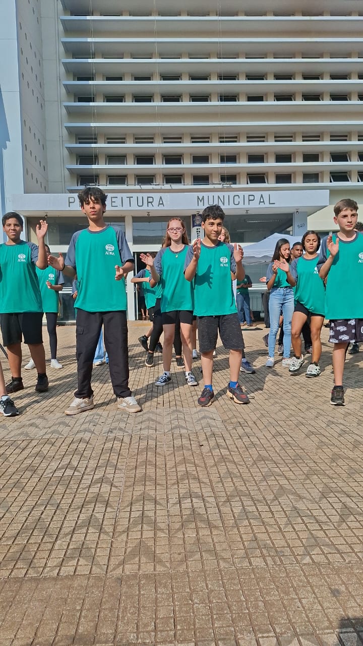 Participantes do projeto fizeram dança coreografada e número musical em frente ao prédio da Prefeitura