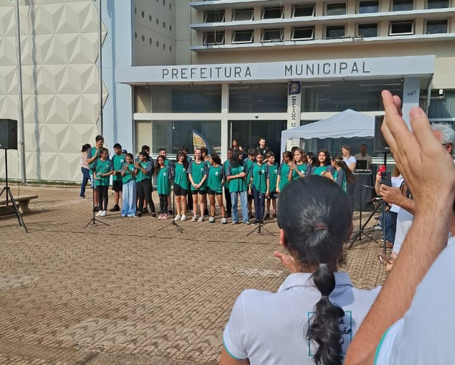 Participantes do projeto fizeram dança coreografada e número musical em frente ao prédio da Prefeitura