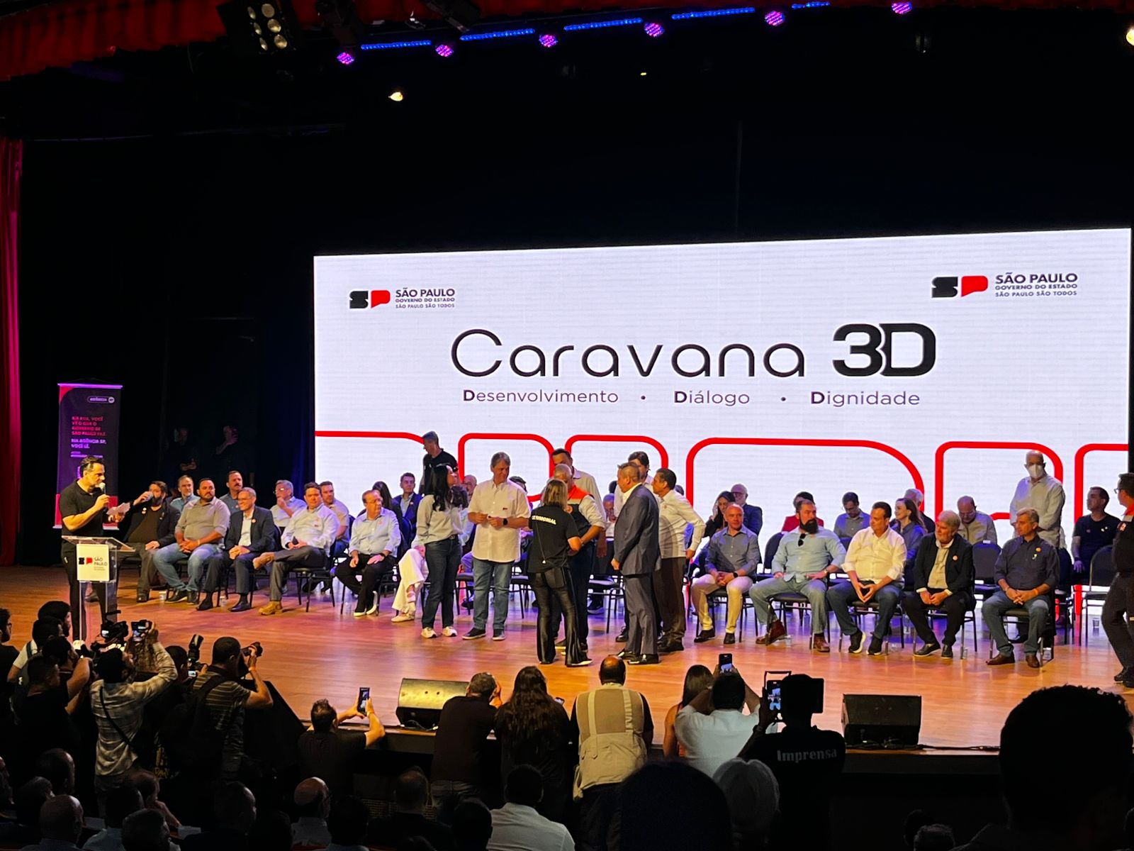 A Caravana 3D é uma iniciativa do Governo de São Paulo que percorre as regiões do estado com o objetivo de aproximar o governo das prefeituras e das comunidades locais, levando políticas públicas estruturadas nos pilares do desenvolvimento, dignidade e diálogo. O programa fortalece a articulação entre o Estado e os municípios, promovendo investimentos e ações concretas que atendem às necessidades regionais.