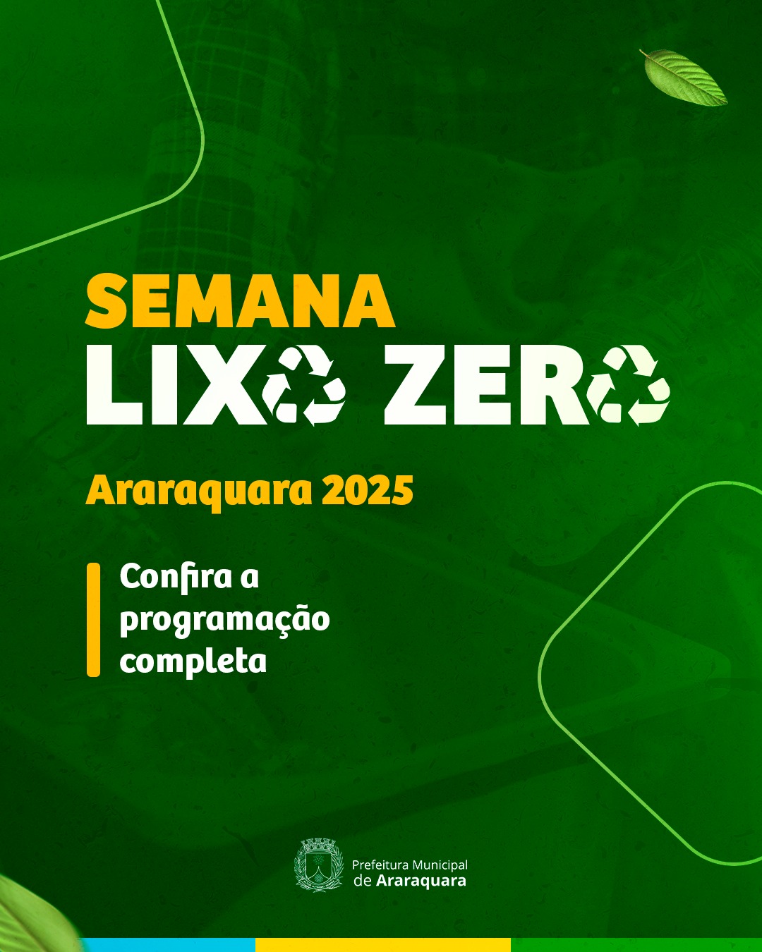 A Prefeitura de Araraquara, por meio da Secretaria Municipal de Meio Ambiente, com apoio das Secretarias da Educação, de Agricultura e Abastecimento e da Escola de Governo, e em parceria com a empresa EcoARES e a Casa Cairbar Schutel, realiza entre os dias 21 e 25 de outubro a Semana Lixo Zero de 2025. A iniciativa, organizada pelo Instituto Lixo Zero Brasil (ILZB), traz uma série de ações que têm como objetivo promover a mobilização cidadã, a educação ambiental e as práticas sustentáveis, trazendo reflexões sobre o consumo e a responsabilidade pelos resíduos.
