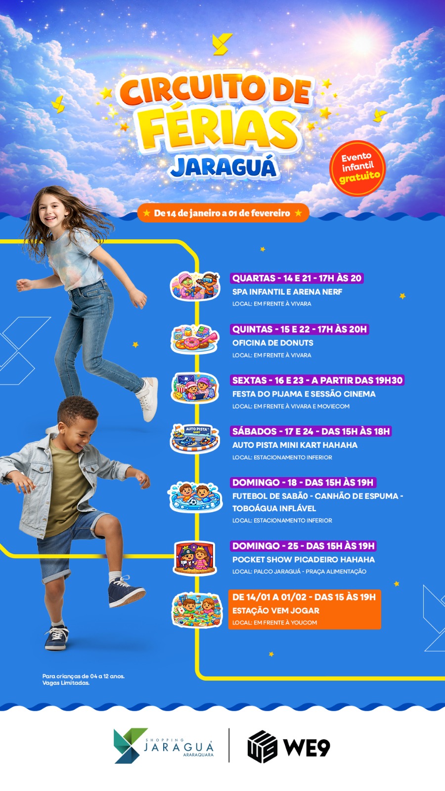 Durante o período de férias escolares, o Shopping Jaraguá Araraquara se transforma em um grande espaço de diversão, aprendizado e convivência com a realização do Circuito de Férias Jaraguá, entre os dias 14 de janeiro e 1º de fevereiro. A programação gratuita foi cuidadosamente planejada para atender crianças de 4 a 12 anos, promovendo experiências que estimulam a criatividade, o movimento, a socialização e o bem-estar.