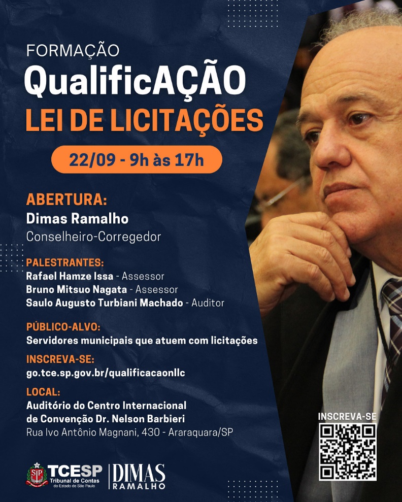 O Conselheiro Vice-Presidente do Tribunal de Contas do Estado de São Paulo (TCESP), Dimas Ramalho, convida para o encontro com o tema ‘Formação QualificAÇÃO Licitações’, que será realizado na segunda-feira (22/9), das 9h00 às 12h00 e das 14h00 às 17h00. A capacitação acontecerá em Araraquara no Auditório do Centro Internacional de Convenção Dr. Nelson Barbieri.