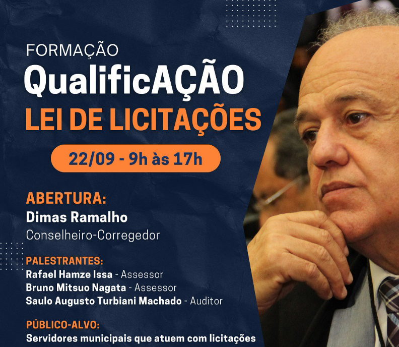 Além da abertura feita pelo Conselheiro Vice-Presidente Dimas Ramalho, haverá a presença do time de palestrantes como o Assessor Técnico-Procurador, Bruno Mitsuo Nagata; o Assessor Técnico, Rafael Hamze Issa e o Auditor de Controle Externo, Saulo Augusto Turbiani Machado.