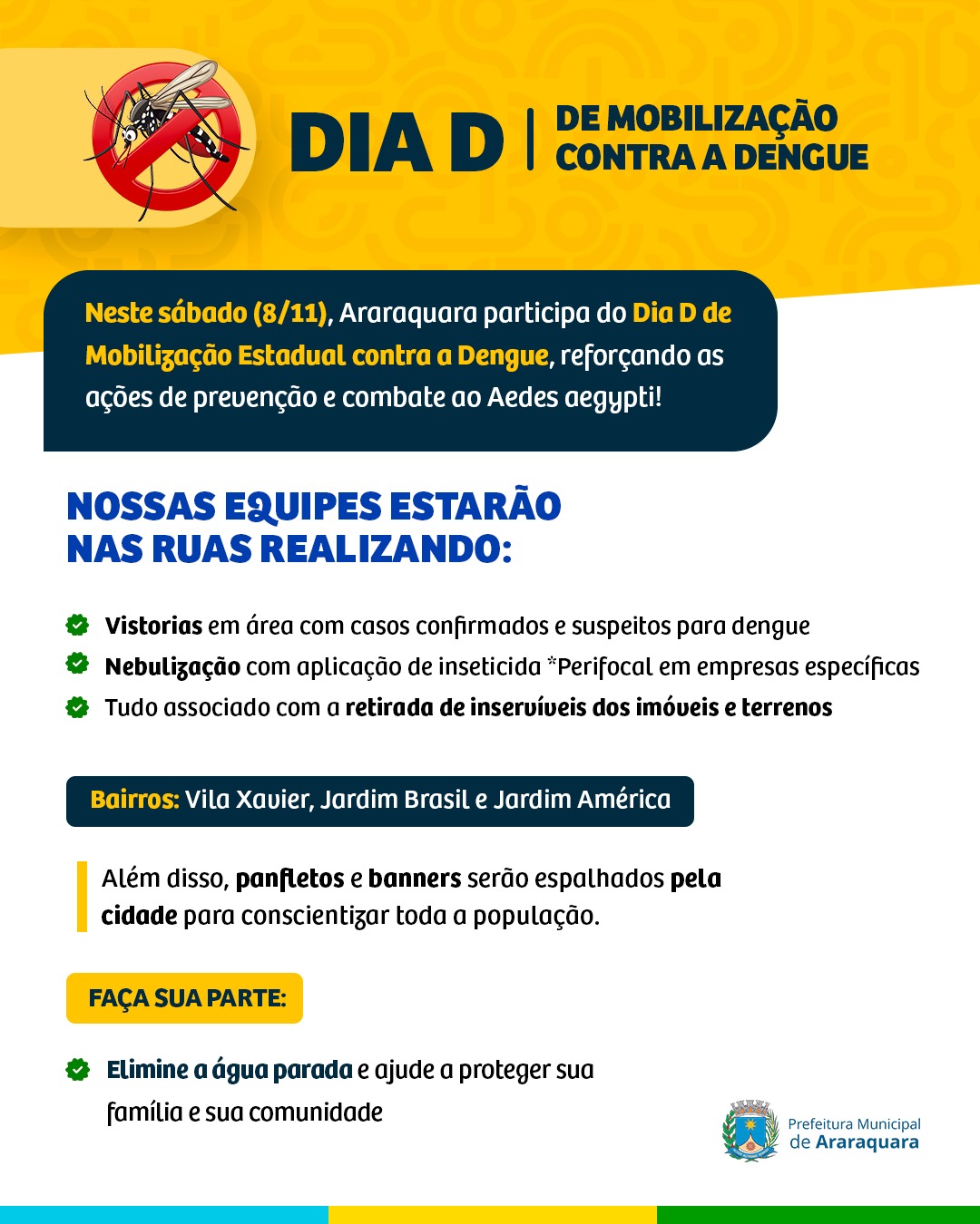 Araraquara participa, neste sábado (8), do “Dia D de Mobilização Estadual contra a Dengue”. A ação, realizada pela Secretaria Municipal da Saúde, visa reforçar a força-tarefa paulista voltada à intensificação das medidas de prevenção e eliminação dos focos do mosquito Aedes aegypti.