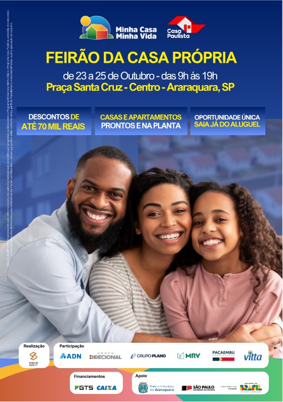 Araraquara recebe na próxima semana, entre os dias 23 e 25, mais um Feirão da Casa Própria. O evento acontece das 9h às 19h na Praça Santa Cruz, no Centro. Para quem pretende sair do aluguel, diversas construtoras e incorporadoras vão negociar casas e apartamentos prontos ou na planta. Além das condições comerciais que variam de acordo com o imóvel e construtora, haverá a possibilidade de realizar o financiamento pela Caixa, por meio dos programas Minha Casa Minha Vida ou Casa Paulista, os quais oferecem subsídios que somados podem alcançar até 70 mil reais conforme a renda.