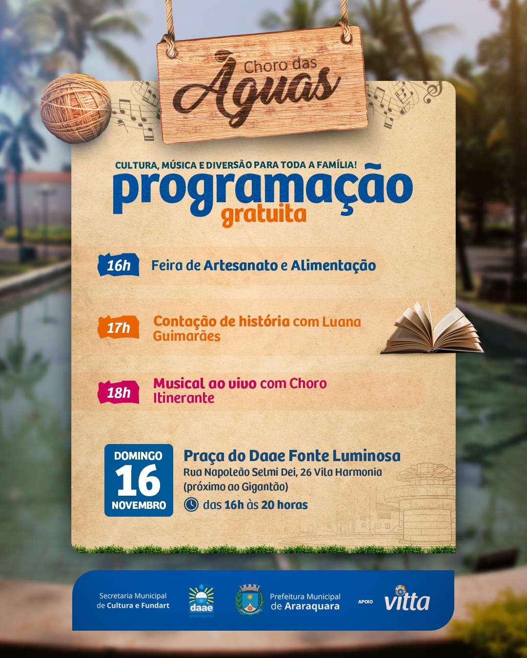 O Choro das Águas deste domingo, 16 de novembro, chega repleto de arte e cultura, reunindo feira de artesanato e alimento, contação de histórias e música ao vivo, com uma programação gratuita pensada para toda a família na Praça do Daae – Fonte Luminosa.