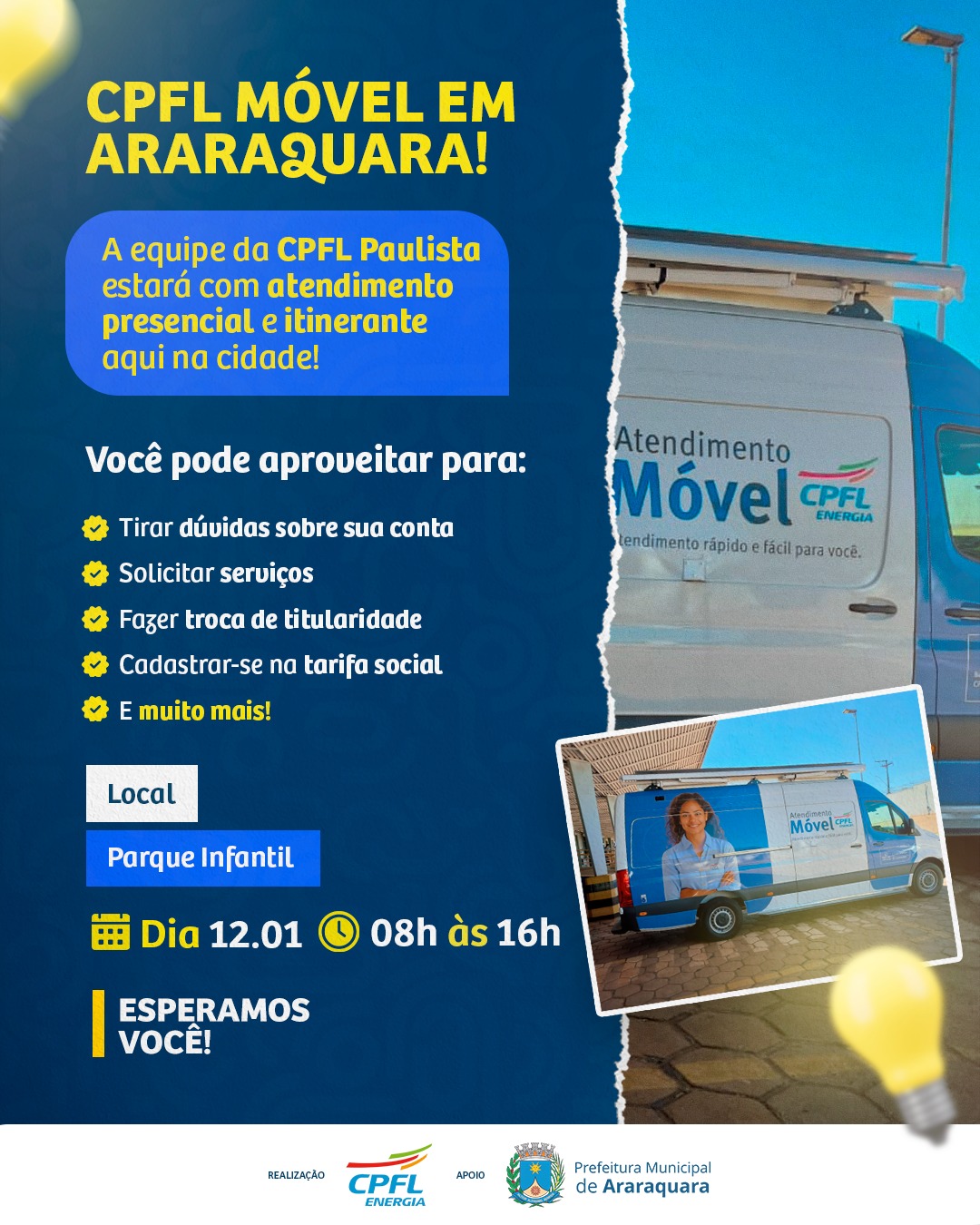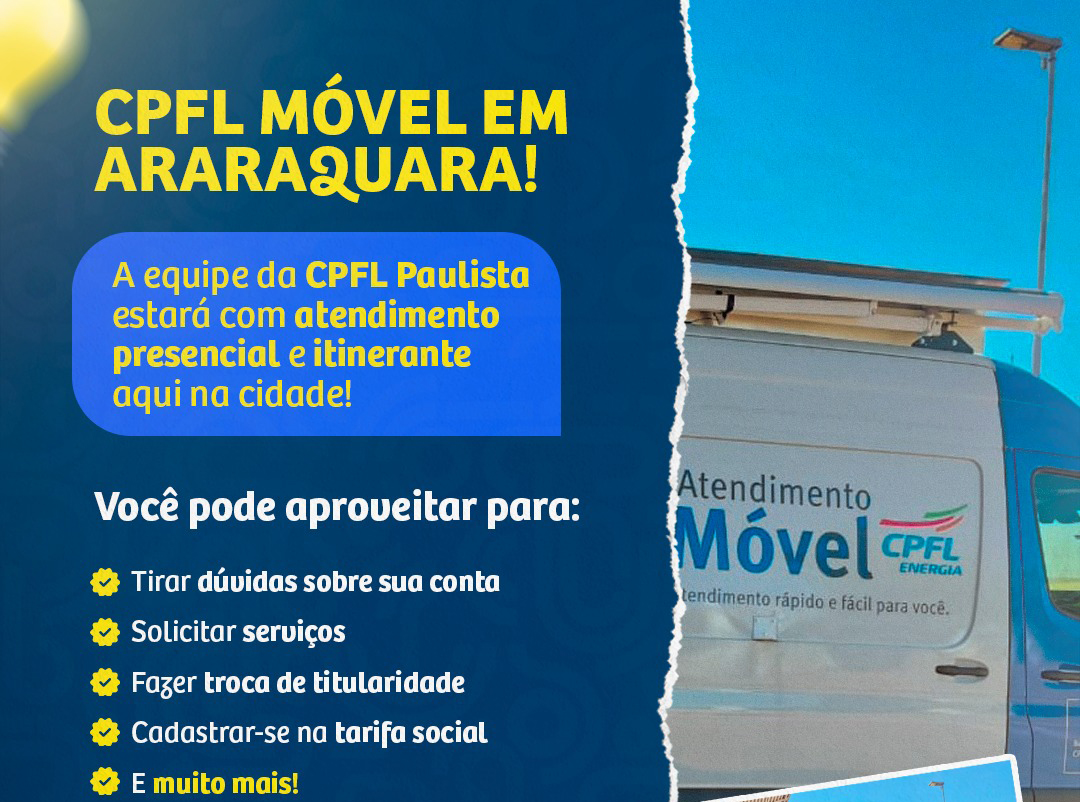 Nesta segunda-feira (12), a unidade itinerante da CPFL Paulista estará no Parque Infantil para prestar atendimento presencial à população de Araraquara. A equipe ficará disponível no local das 8h às 16h.