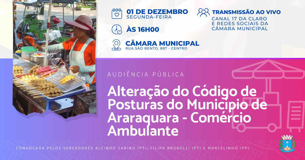 Com o objetivo de discutir alterações na Lei Complementar nº 18/1997, que institui o Código de Posturas do Município, a Câmara Municipal irá promover uma Audiência Pública sobre o tema. A iniciativa é dos vereadores Alcindo Sabino (PT) e Marcelinho (Progressistas), e da vereadora Filipa Brunelli (PT), que buscam adequar a legislação às necessidades atuais, especialmente no que diz respeito ao comércio ambulante.