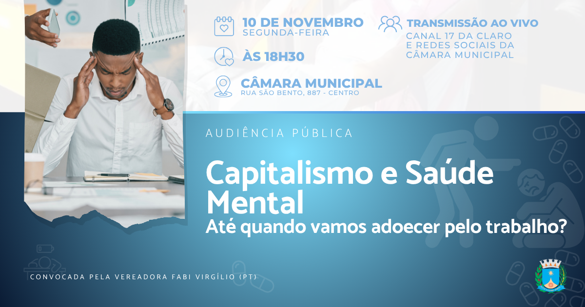 A Câmara Municipal realiza, nesta segunda-feira (10), às 18h30, a Audiência Pública “Capitalismo e Saúde Mental: até quando vamos adoecer pelo trabalho?”, de iniciativa da vereadora Fabi Virgílio (PT).