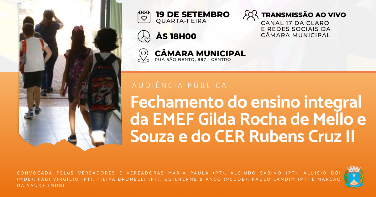 Uma Audiência Pública para discutir o possível fechamento do ensino integral da Escola Municipal de Ensino Fundamental (Emef) “Gilda Rocha de Mello e Souza” e do Centro de Educação e Recreação (CER) “Rubens Cruz” acontecerá na quarta-feira (19), às 18 horas, no Plenário da Câmara.