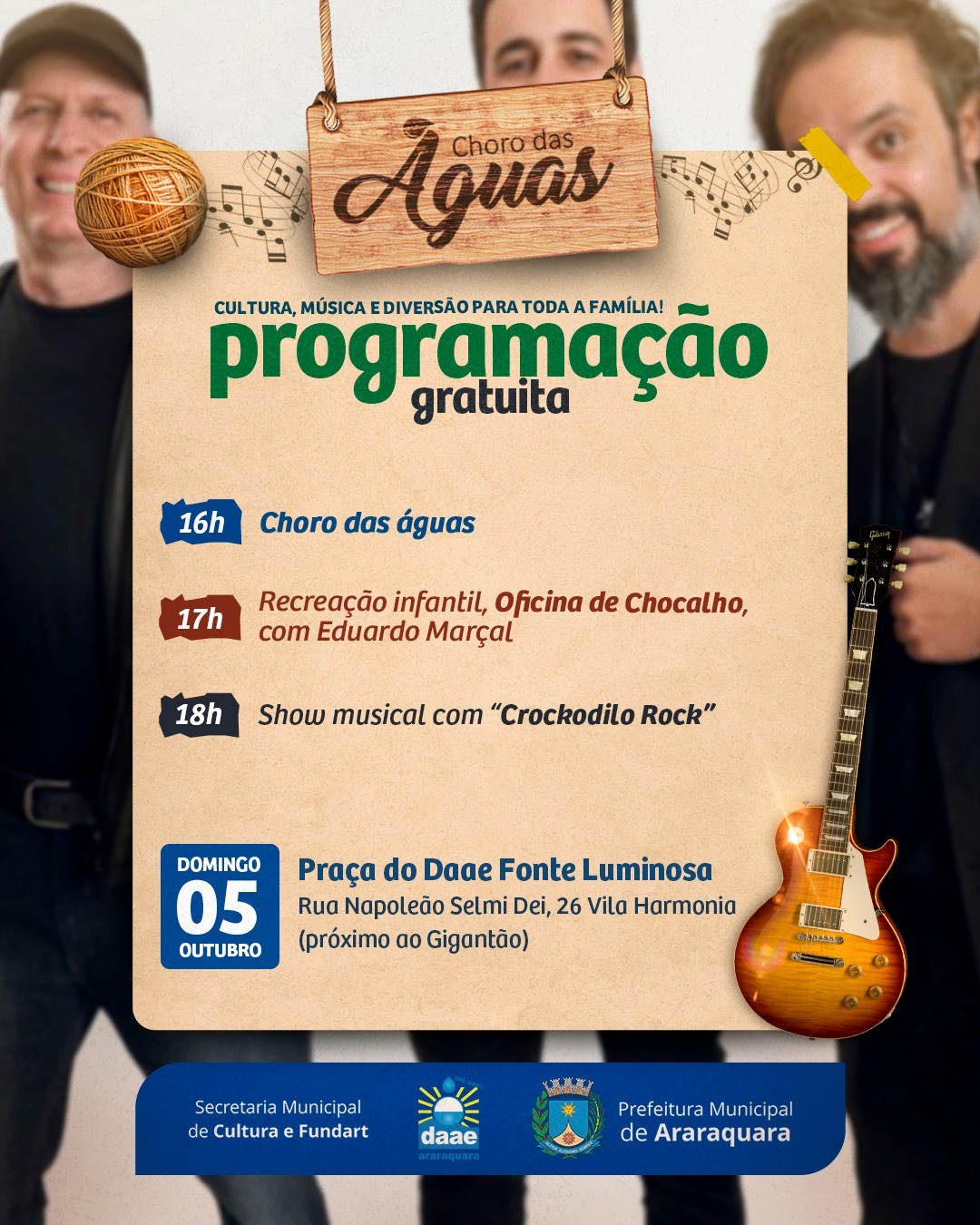O rock dá o tom da apresentação musical deste domingo (5) no Choro das Águas, na Praça do Daae – Fonte Luminosa. A banda Crockodilo Rock é a convidada para o show das 18 horas; mas a programação da Secretaria Municipal da Cultura e Fundart tem início antes: às 16 horas tem a Feira de Artesanato e às 17h tem Oficina de Chocalho com Eduardo Marçal.