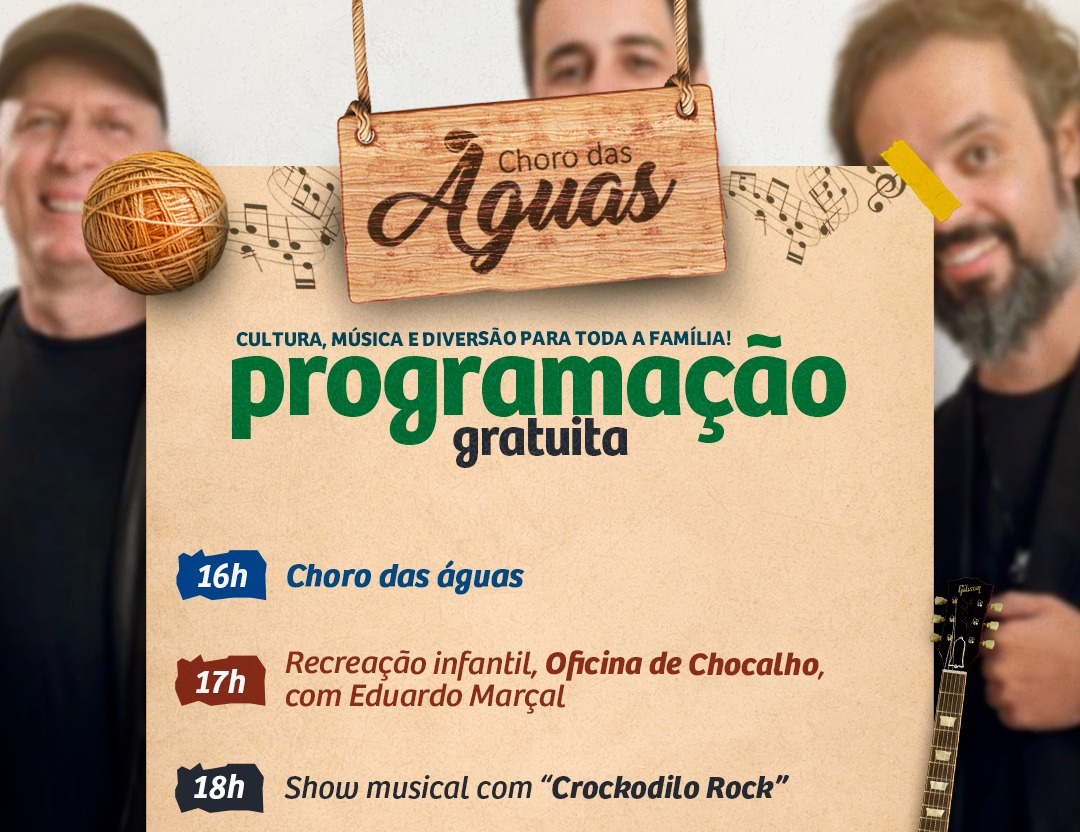 O rock dá o tom da apresentação musical deste domingo (5) no Choro das Águas, na Praça do Daae – Fonte Luminosa. A banda Crockodilo Rock é a convidada para o show das 18 horas; mas a programação da Secretaria Municipal da Cultura e Fundart tem início antes: às 16 horas tem a Feira de Artesanato e às 17h tem Oficina de Chocalho com Eduardo Marçal.