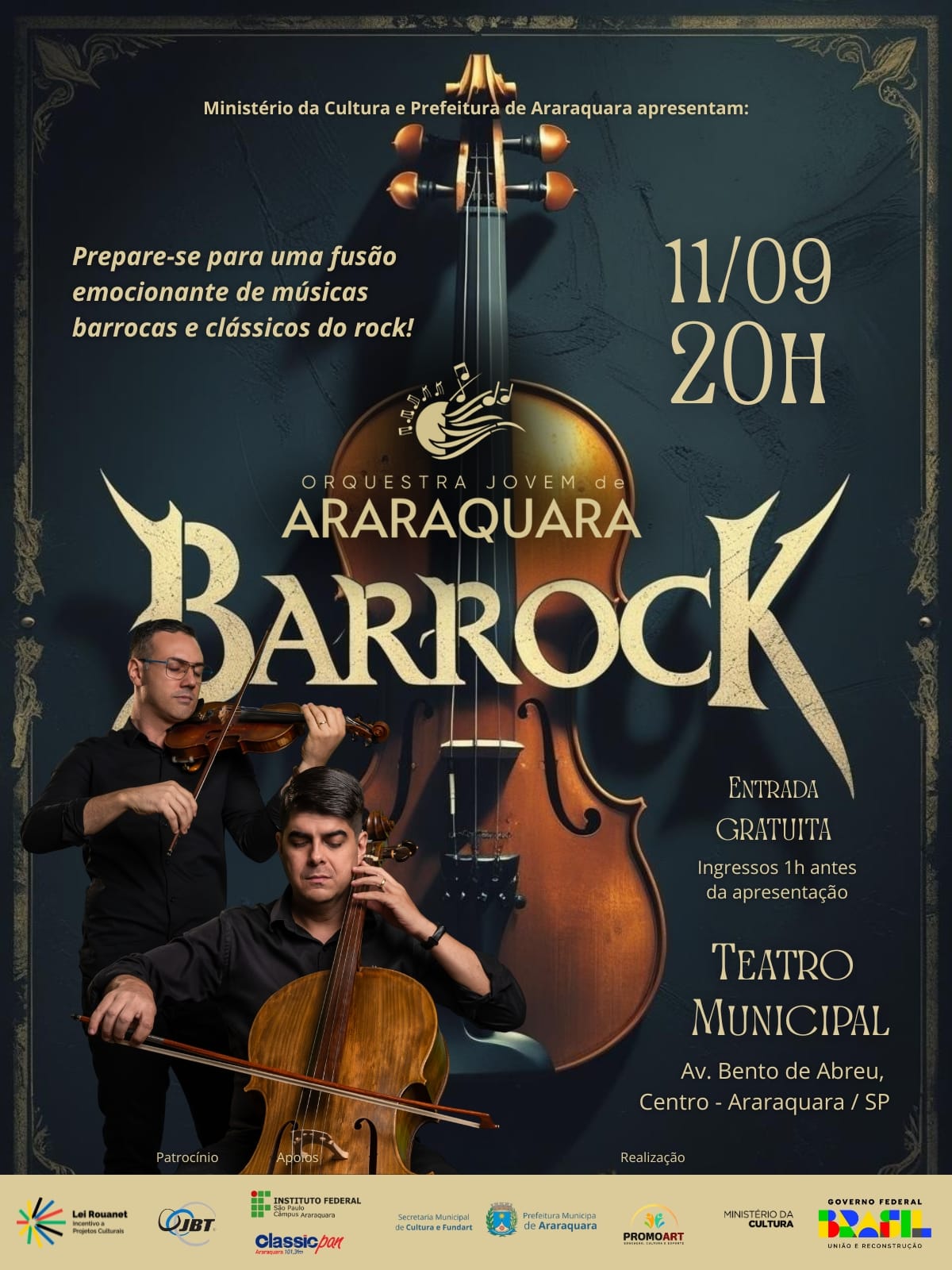 A Orquestra Jovem de Araraquara (OJA) promove no próximo 11 de setembro, quinta-feira, às 20 horas, no Teatro Municipal de Araraquara, o concerto gratuito intitulado “Barrock”. A apresentação é uma realização do Ministério da Cultura e da Prefeitura de Araraquara, por meio da Secretaria Municipal de Cultura e Fundart, sendo os ingressos gratuitos e solidários distribuídos na bilheteria do teatro, uma hora antes do início, com a doação opcional de um quilo de alimento não perecível.