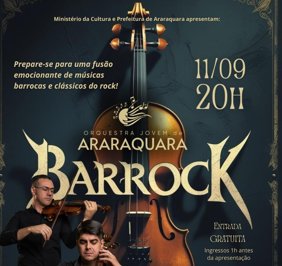 A Orquestra Jovem de Araraquara (OJA) promove no próximo 11 de setembro, quinta-feira, às 20 horas, no Teatro Municipal de Araraquara, o concerto gratuito intitulado “Barrock”. A apresentação é uma realização do Ministério da Cultura e da Prefeitura de Araraquara, por meio da Secretaria Municipal de Cultura e Fundart, sendo os ingressos gratuitos e solidários distribuídos na bilheteria do teatro, uma hora antes do início, com a doação opcional de um quilo de alimento não perecível.
