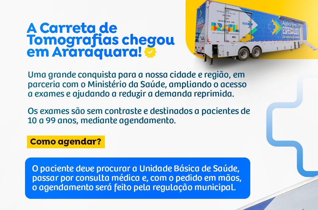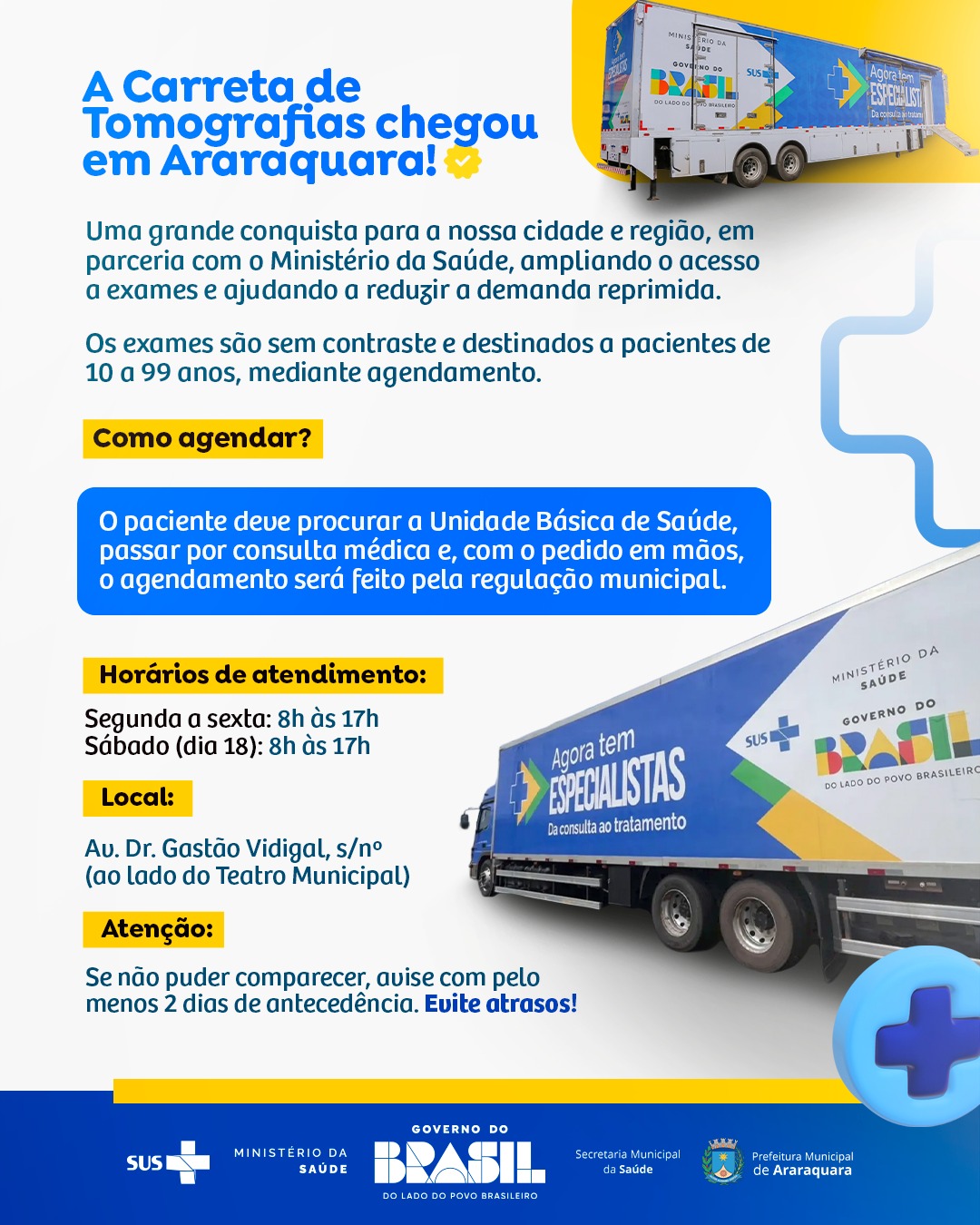 Araraquara foi um dos municípios selecionados para receber a carreta de exames de imagem tomografia do programa “Agora Tem Especialistas” do Ministério da Saúde. O equipamento estará na Av. Dr. Gastão Vidigal, s/nº, ao lado do Teatro Municipal, até o dia 15 de maio. As tomografias sem contraste serão realizadas de segunda a sexta-feira, das 8h às 17h. No sábado (18), o atendimento acontece no mesmo horário. A previsão é que sejam realizados cerca de dois mil procedimentos.