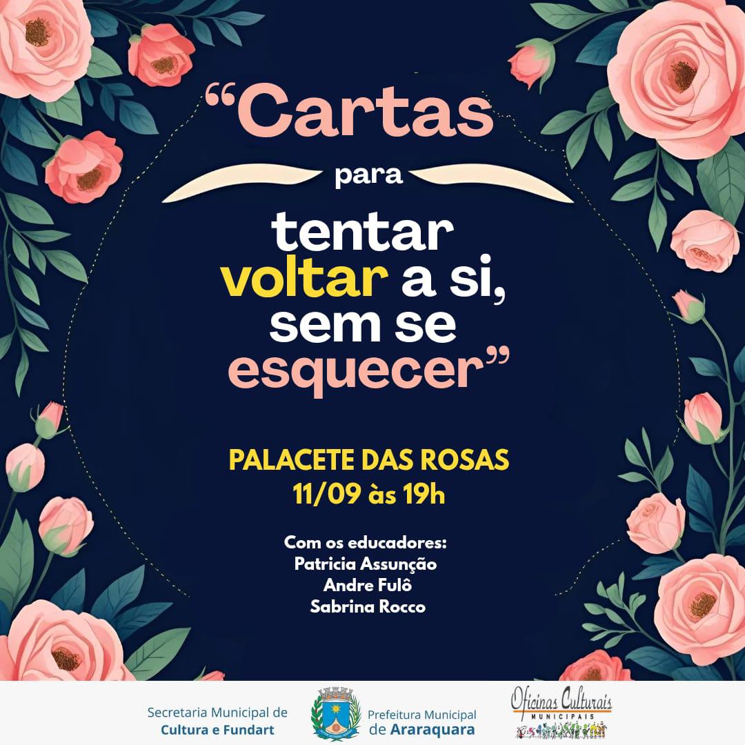Nesta quinta-feira, 11 de setembro, o Palacete das Rosas Paulo A.C. Silva abre suas portas para um encontro especial: a apresentação cênica “Cartas para voltar a si, sem se esquecer”, resultado do trabalho das Oficinas Culturais de Araraquara, por meio da educadora de teatro Patrícia Assunção, junto às mulheres acolhidas pela Casa de Acolhimento São Pio. O espetáculo, com início às 19h, tem classificação indicativa de 18 anos e entrada gratuita, mediante retirada de ingressos uma hora antes (80 vagas).