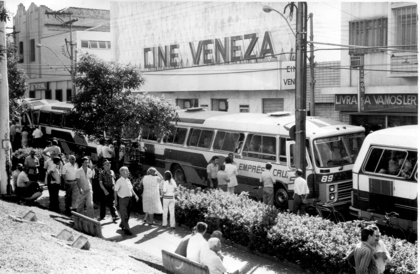 Movimento dos Ferroviários em frente ao Cine Veneza em 1981. Oscar Sbaglia e Florisvaldo Catellani, Sérgio Médici e Paulo Sérgio Sgobbi, em 13 de novembro