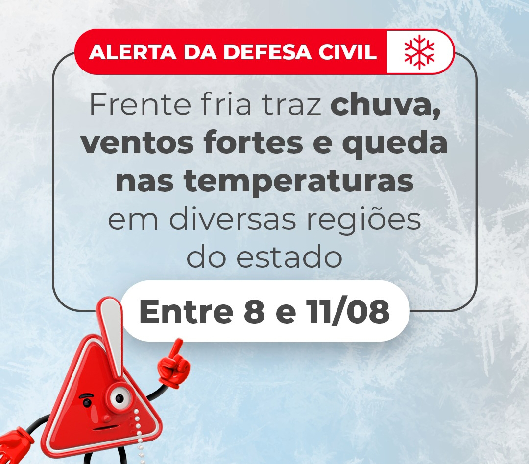 A atuação de uma frente fria provocará mudanças significativas nas condições do tempo em diversas regiões do estado, trazendo chuva, ventos fortes e queda nas