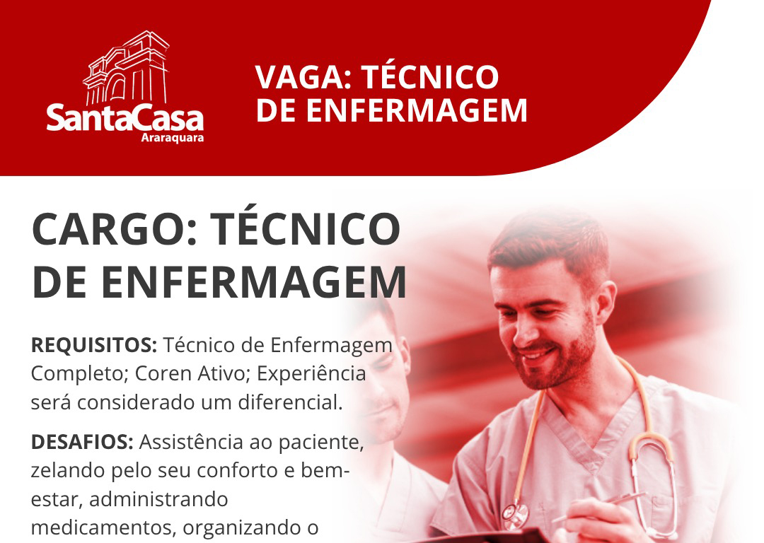 Os currículos atualizados podem ser entregues através do WhatsApp da instituição com o título técnico de enfermagem A Santa Casa está com vagas abertas para