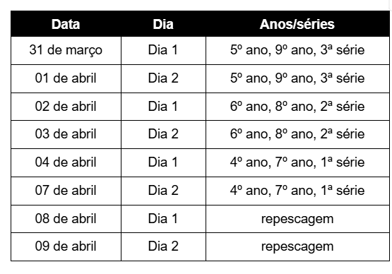 A Seduc-SP definiu dois dias de prova para cada ano/série (veja tabela abaixo), sempre no mesmo turno de aula em que o aluno está matriculado. Todas as questões são de múltipla escolha com apenas uma alternativa correta, mas a quantidade e as disciplinas variam de acordo com a etapa: