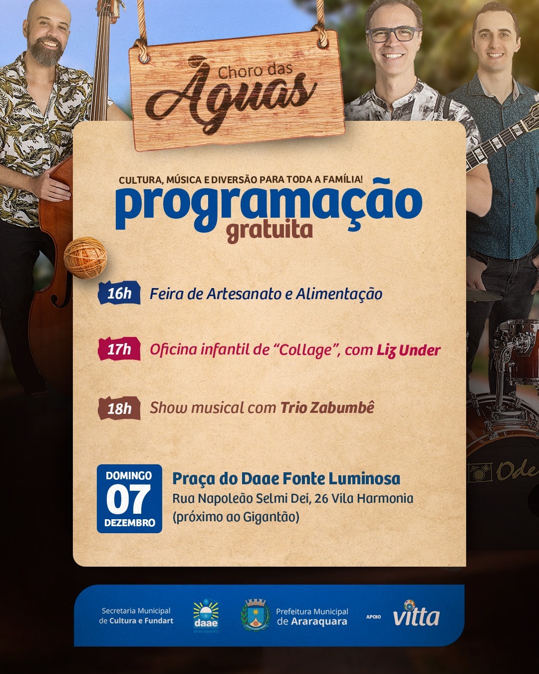 A programação do Choro das Águas deste domingo (7) está especial: começa às 16h com a Feira de Artesanato; depois segue com a oficina infantil de “Collage”, às 17h, com a artista premiada no Território da Arte, Liz Under; e se encerra com o show musical do Trio Zabumbê, às 18h. A programação gratuita, realizada pela Secretaria Municipal de Cultura e Fundart com o apoio da Vitta Construtora e Incorporadora e do Daae Araraquara, é gratuita e é realizada na Praça do Daae – Fonte Luminosa.