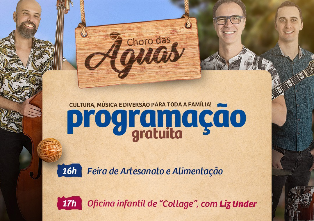 A programação do Choro das Águas deste domingo (7) está especial: começa às 16h com a Feira de Artesanato; depois segue com a oficina infantil de “Collage”, às 17h, com a artista premiada no Território da Arte, Liz Under; e se encerra com o show musical do Trio Zabumbê, às 18h. A programação gratuita, realizada pela Secretaria Municipal de Cultura e Fundart com o apoio da Vitta Construtora e Incorporadora e do Daae Araraquara, é gratuita e é realizada na Praça do Daae – Fonte Luminosa.