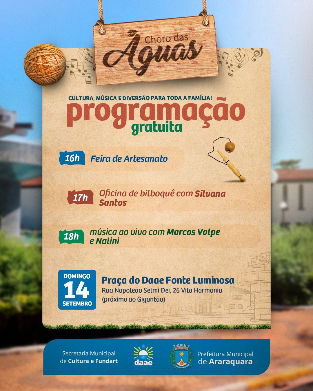 Show musical com Marcos Volpe e Nalini, oficina de bilboquê e feira com artesãos e empreendedores movimentam a Praça do DAAE, das 16h às 21h