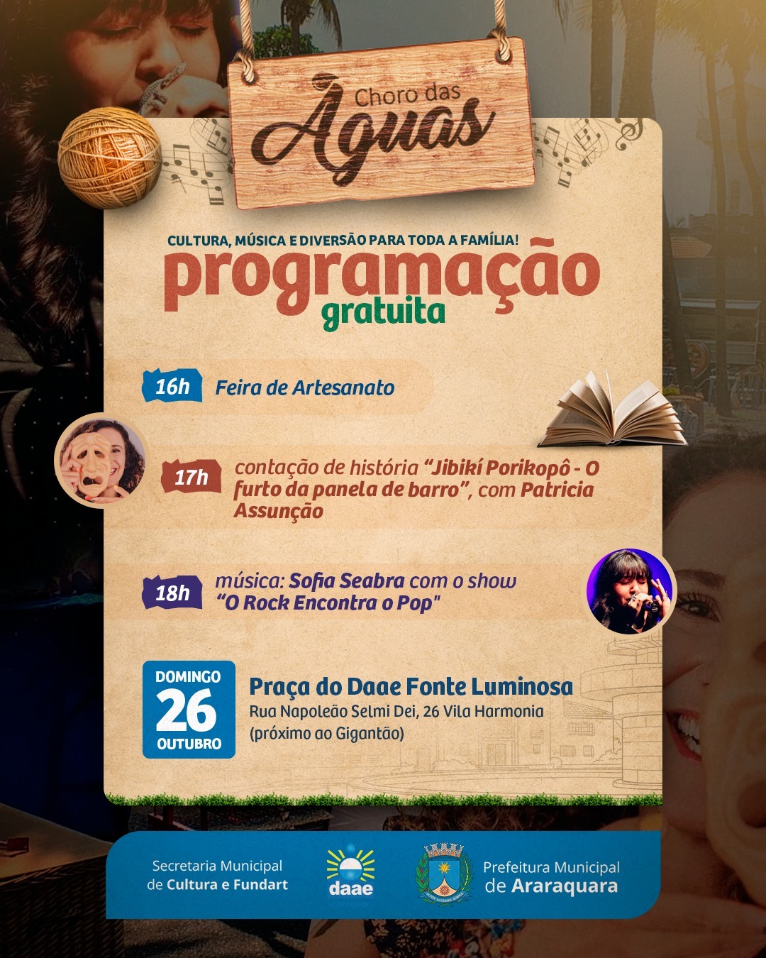 O projeto Choro das Águas, realizado pela Secretaria Municipal da Cultura e Fundart, promete uma tarde de atrações variadas e para todas as idades neste domingo (26), na Praça do Daae – Fonte Luminosa. Na programação, destaque para a apresentação música com Sofia Seabra no show “O Rock Encontra o Pop”, além de contação de histórias com a atriz Patricia Assunção e a tradicional feira de artesanato.