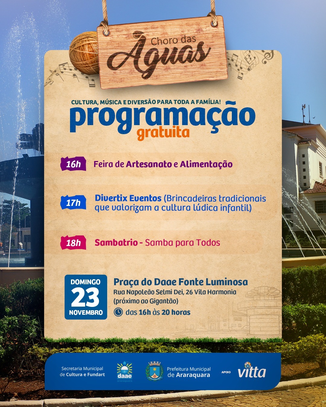 Os momentos de lazer estão garantidos na programação deste domingo (23) com o Choro das Águas, na Praça do DAAE – Fonte Luminosa, das 16h às 21 horas. O programa realizado pela Prefeitura de Araraquara, por meio da Secretaria Municipal de Cultura e Fundart com apoio da Vitta Construtora e Incorporadora e em parceria com o DAAE, conta com apresentação musical, feira de artesanato e alimentos e atividade artística infantil.