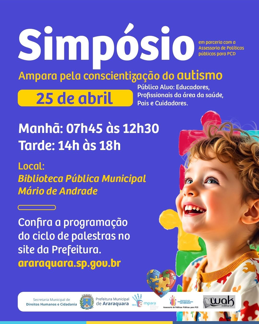 Com apoio da Prefeitura, a Ampara (Associação de Pais e amigos dos autistas de Araraquara e mãe atípica), em parceria com a Assessoria de Polícias Públicas para PCDs – órgão da Secretaria Municipal de Direitos Humanos e Cidadania -, realizará na cidade, nesta sexta-feira (25), o simpósio “Ampara – pela conscientização do autismo”.