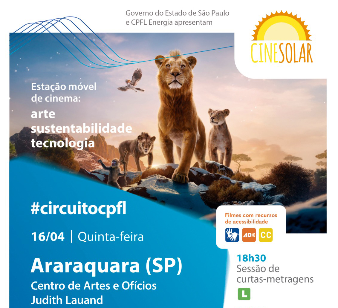 O CineSolar, o primeiro cinema itinerante movido a energia solar do Brasil, será vivenciado ao ar livre em Araraquara, na quinta-feira (16/04), a partir das 18h30, no Centro de Artes e Ofícios Judith Lauand, na Vila Xavier. Em caso de chuva, o evento acontece no Sesi Araraquara. Com acesso gratuito e livre para todas as idades, a sessão de cinema aborda temas como sustentabilidade, ciências e tecnologia e, na telona, serão exibidos curtas-metragens e a animação “Mufasa: O Rei Leão”. Os filmes contam com recursos de acessibilidade e tem distribuição de pipoca.