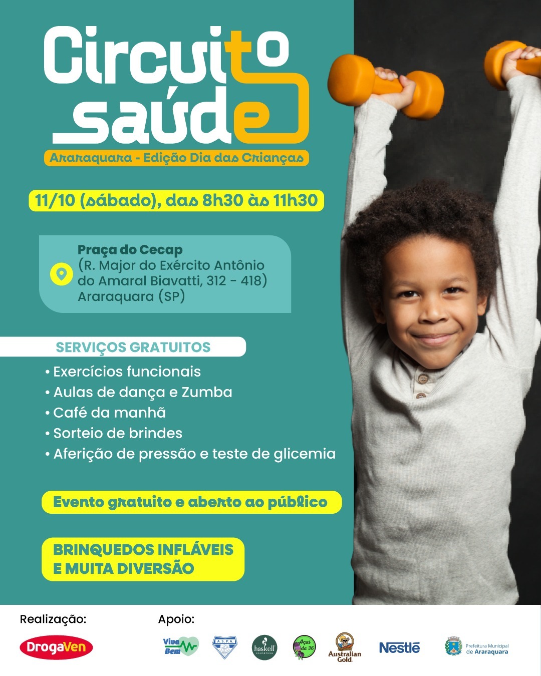 Com apoio de várias empresas parceiras, como DrogaVen e ASPA, a Prefeitura oferece neste sábado (11), por meio da Secretaria Municipal de Esportes e Lazer, o Circuito Saúde, com uma série de atrações gratuitas, na Praça do Cecap.