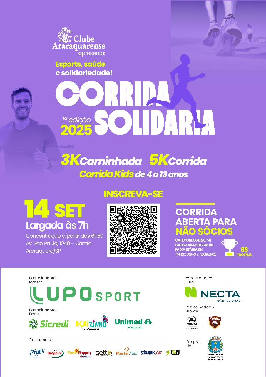 Sob o slogan “Esporte, saúde e solidariedade”, o Clube Araraquarense organiza, na cidade, a 1ª Edição da Corrida e Caminhada Solidária, em prol do Fundo Social de Solidariedade do Município.