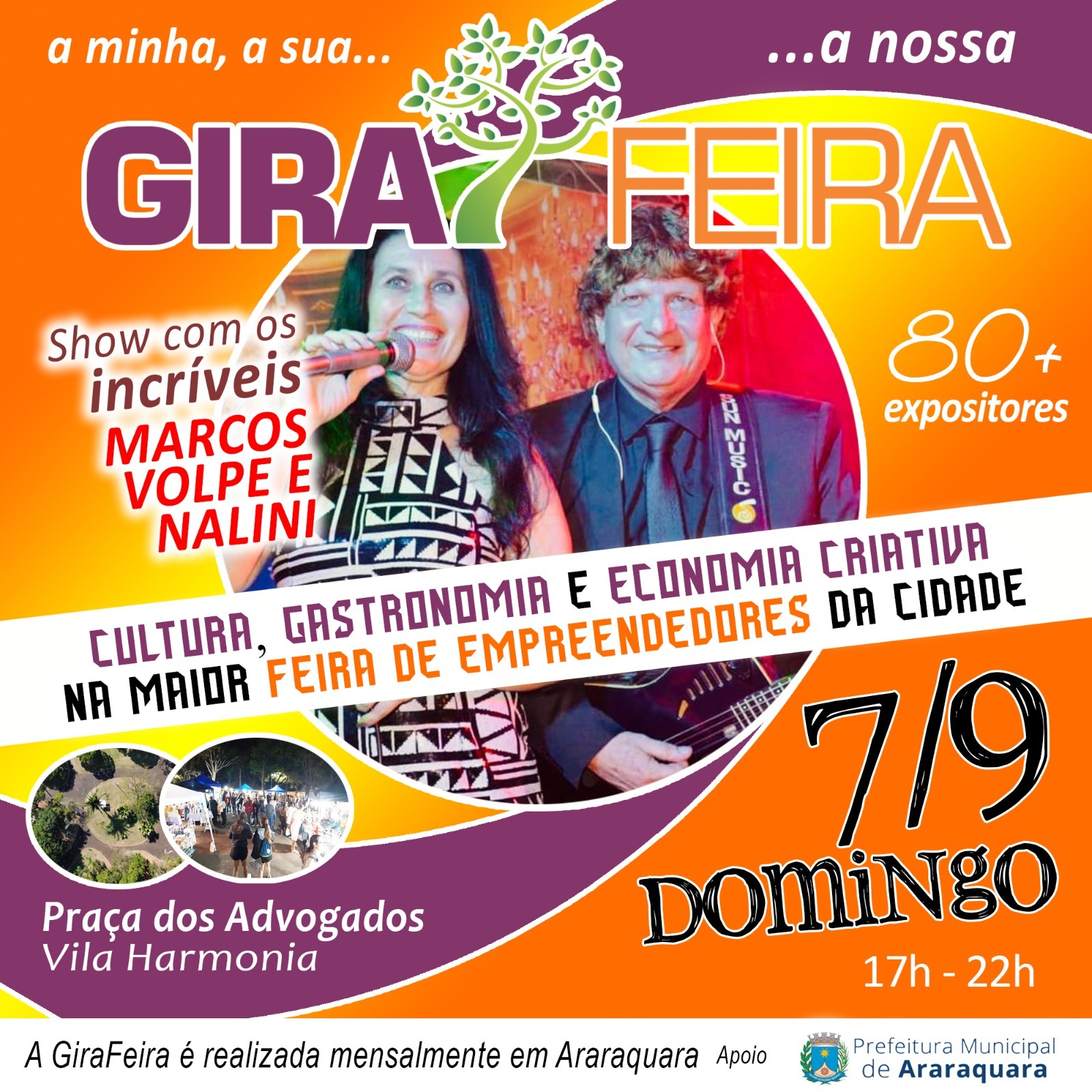 Além de uma diversidade de produtos artesanais, que vão de peças de decoração a acessórios, moda e gastronomia, o público contará com atrações musicais ao vivo. Nesta edição, o palco receberá o talento de Marcos Volpe e Nalini, que trarão ainda mais energia para a feira, em uma realização da Secretaria Municipal de Cultura e Fundart. A dupla apresenta repertório com músicas das décadas de 60, 70 e 80, com canções de Rita Lee e clássicos da MPB.