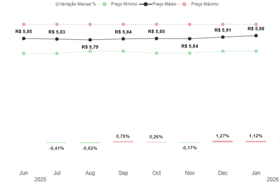 O preço médio da gasolina passou de R$ 5,91 em dezembro para R$ 5,98 em janeiro.