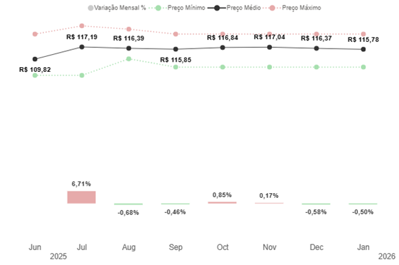 Gás Liquefeito de Petróleo: evolução dos preços mínimo, médio e máximo em Araraquara e variação mensal – junho de 2025 a janeiro de 2026