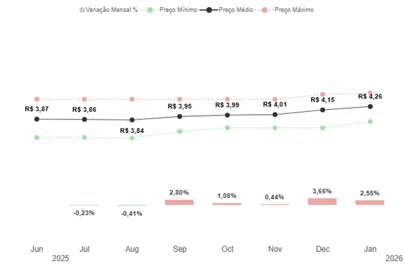 Óleo Diesel: evolução dos preços mínimo, médio e máximo em Araraquara e variação mensal – junho de 2025 a janeiro de 2026