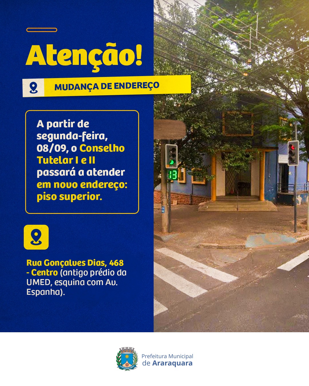 A Prefeitura de Araraquara, por meio da Secretaria Municipal de Desenvolvimento Social, informa que, a partir da próxima segunda-feira (08), os Conselhos Tutelares I e II passam a atender em novo endereço: Rua Gonçalves Dias, nº 468, no Centro (antigo prédio da UMED, esquina com a Avenida Espanha) – Piso Superior.