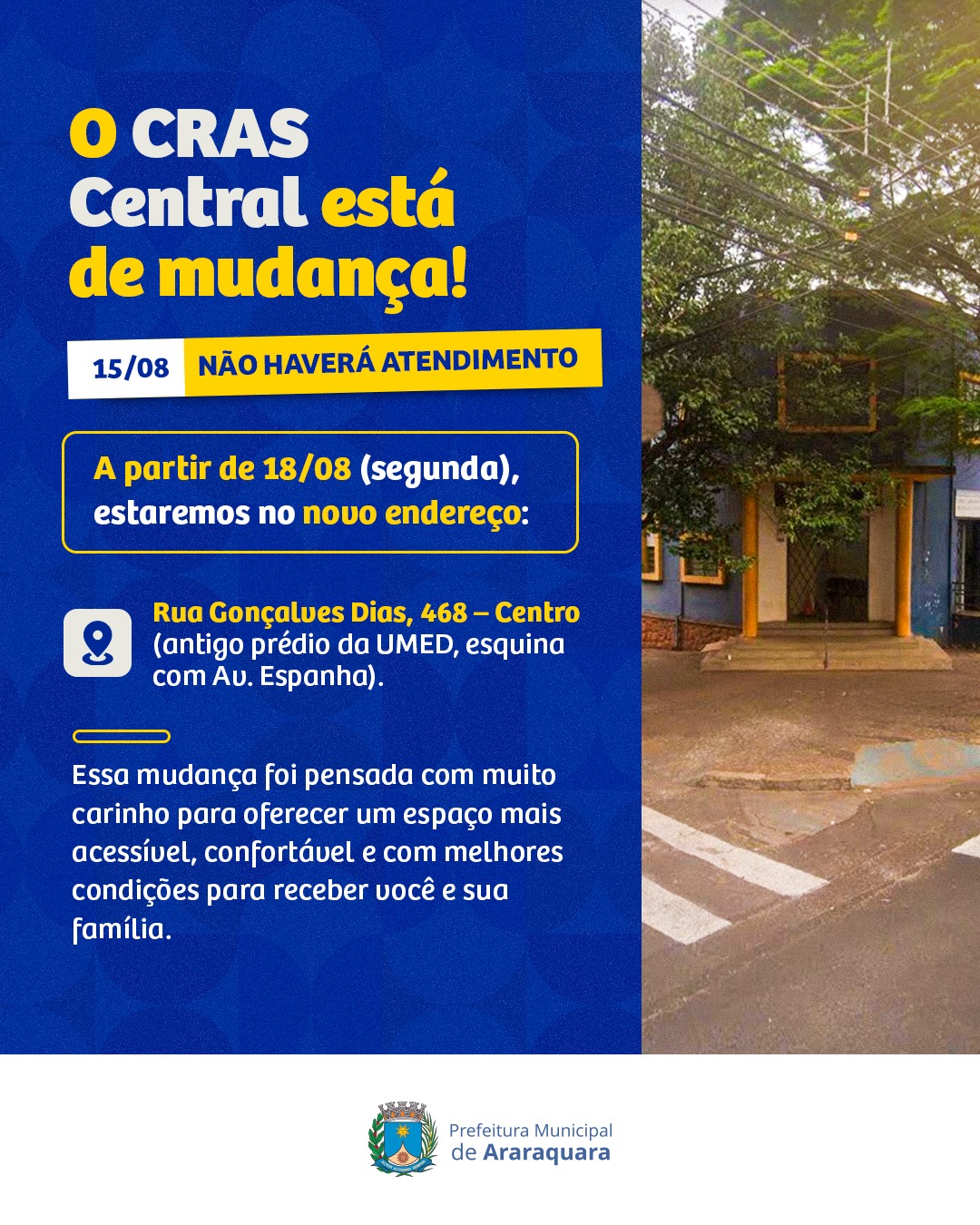A Prefeitura de Araraquara informa que o CRAS Central está de mudança para um novo espaço, planejado para oferecer mais conforto, acessibilidade e melhores condições de atendimento à população.