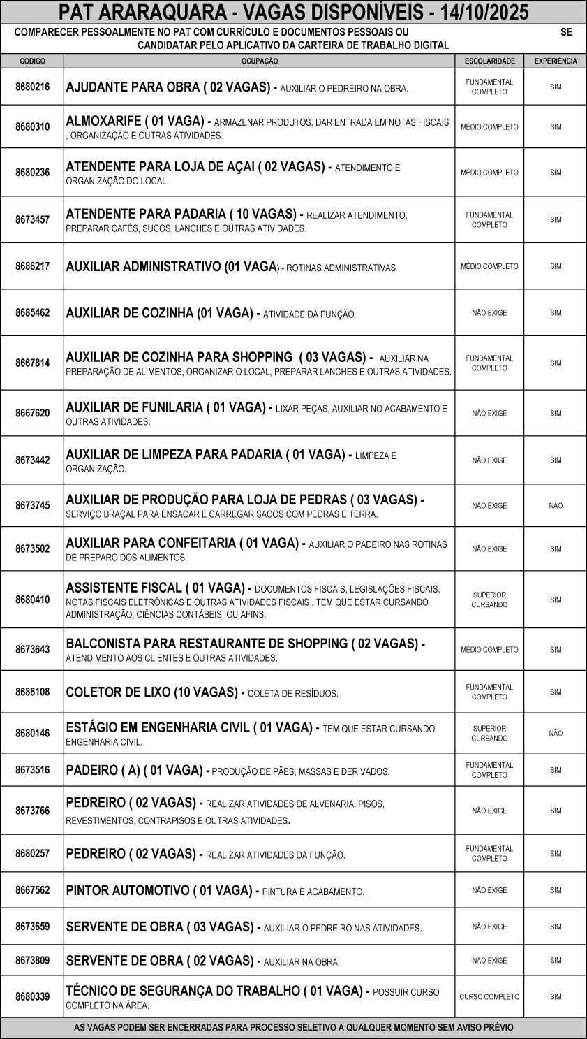 O município, em parceria com governo do Estado de São Paulo, realiza a intermediação entre empresas que oferecem vagas para trabalhos e trabalhadores em busca de emprego. O PAT também faz a habilitação ao Seguro-Desemprego e oferece orientações sobre a emissão da carteira de trabalho virtual. O PAT Araraquara conta com a divulgação de suas vagas nas redes sociais, facilitando o envio de currículos dos candidatos que não possuem condições de acessar presencialmente o serviço.