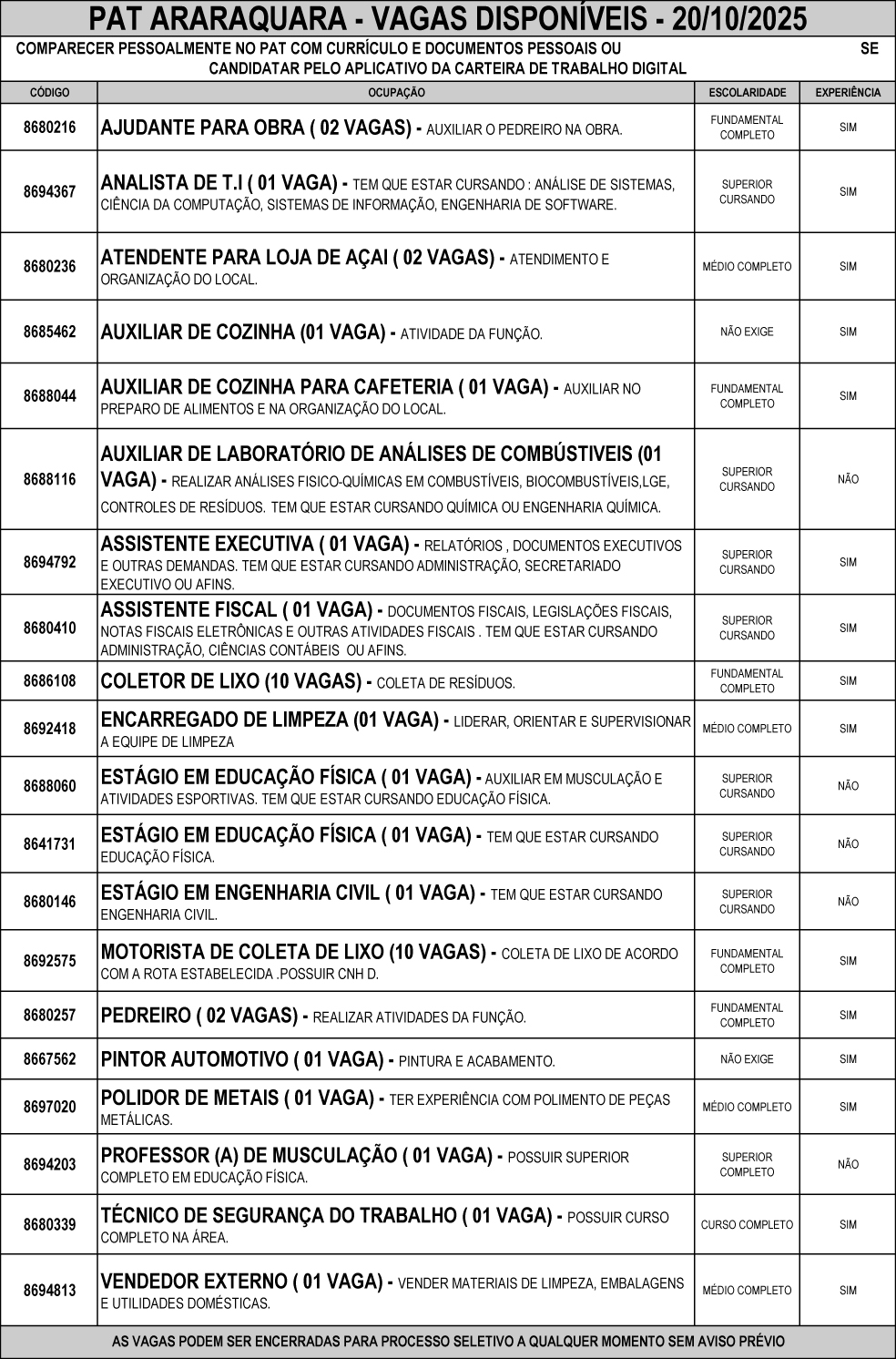 Confira as vagas de emprego disponíveis no PAT de Araraquara