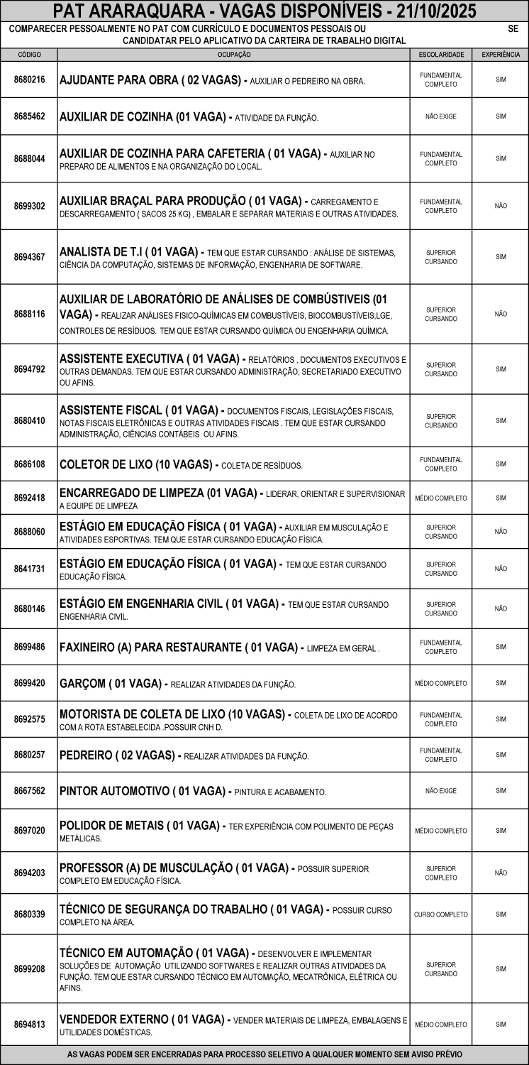 O município, em parceria com governo do Estado de São Paulo, realiza a intermediação entre empresas que oferecem vagas para trabalhos e trabalhadores em busca de emprego. O PAT também faz a habilitação ao Seguro-Desemprego e oferece orientações sobre a emissão da carteira de trabalho virtual. O PAT Araraquara conta com a divulgação de suas vagas nas redes sociais, facilitando o envio de currículos dos candidatos que não possuem condições de acessar presencialmente o serviço.