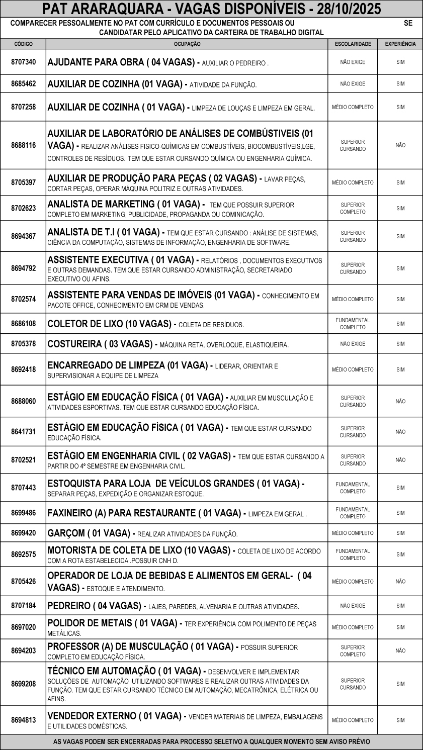 Confira as vagas de emprego disponíveis no PAT de Araraquara