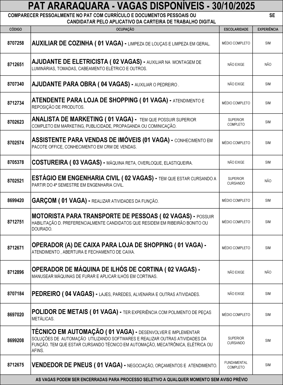 Comparecer pessoalmente no PAT com currículo e documentos pessoais ou se candidatar pelo aplicativo da carteira de trabalho digital. Com o app da Carteira de Trabalho Digital, o candidato encontra as melhores vagas e se candidata com apenas alguns toques!