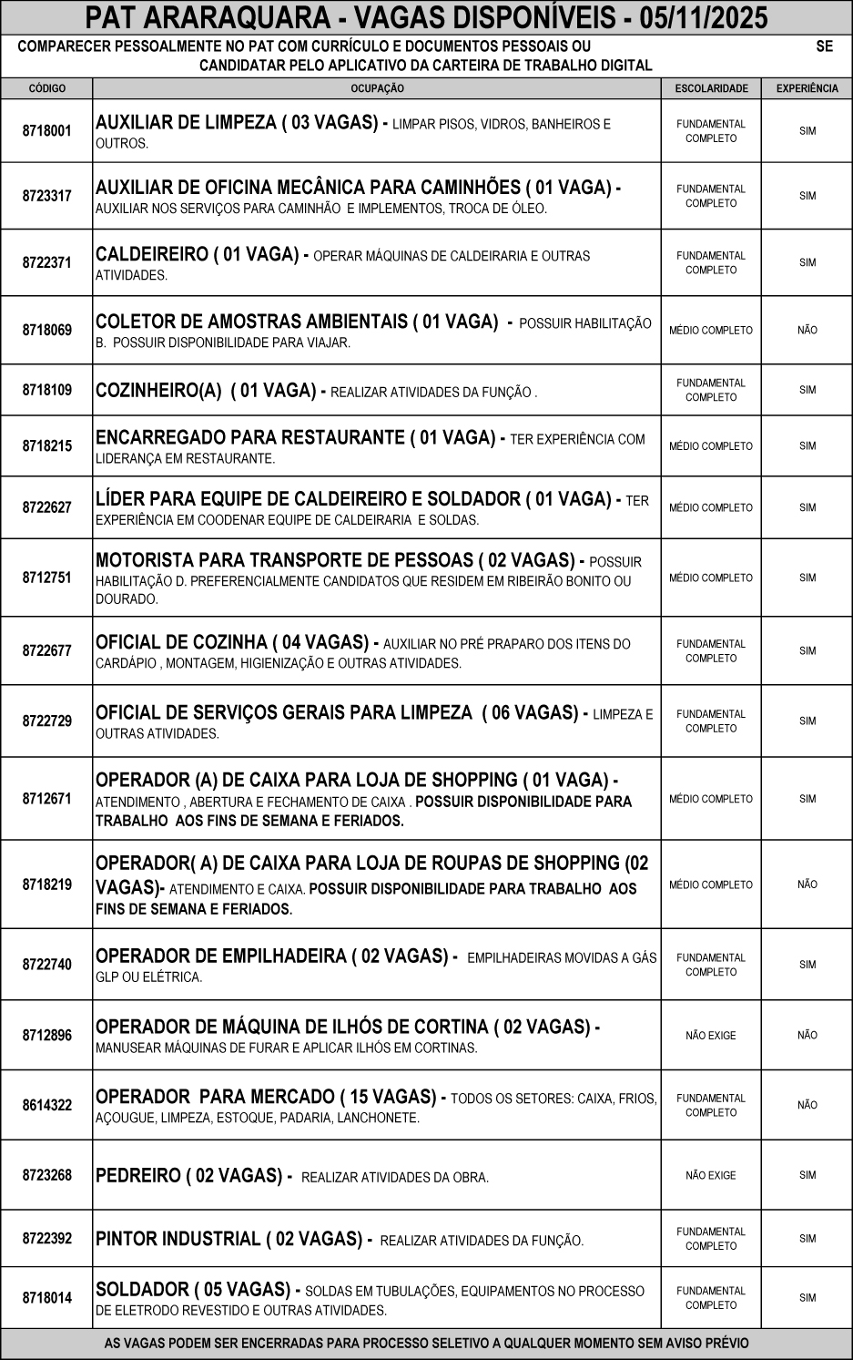 Confira as vagas de emprego disponíveis no PAT de Araraquara