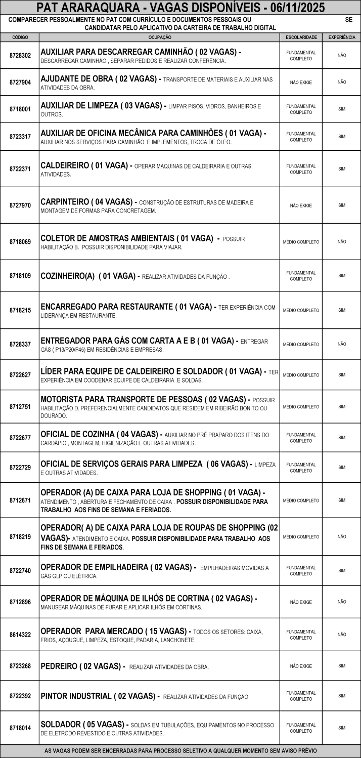 Confira as vagas de emprego disponíveis no PAT de Araraquara
