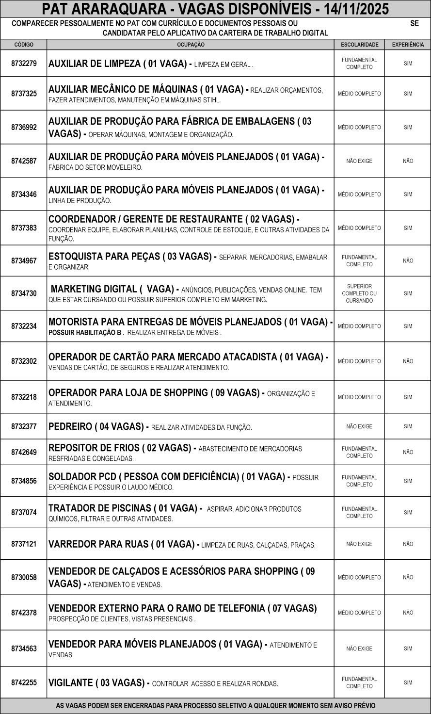 Confira as vagas de emprego disponíveis no PAT de Araraquara