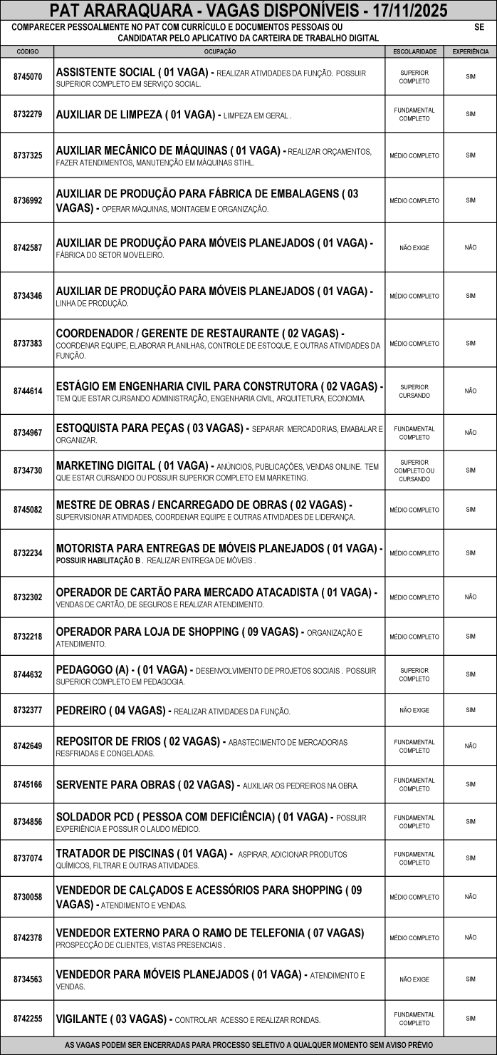 O município, em parceria com governo do Estado de São Paulo, realiza a intermediação entre empresas que oferecem vagas para trabalhos e trabalhadores em busca de emprego. O PAT também faz a habilitação ao Seguro-Desemprego e oferece orientações sobre a emissão da carteira de trabalho virtual. O PAT Araraquara conta com a divulgação de suas vagas nas redes sociais, facilitando o envio de currículos dos candidatos que não possuem condições de acessar presencialmente o serviço.