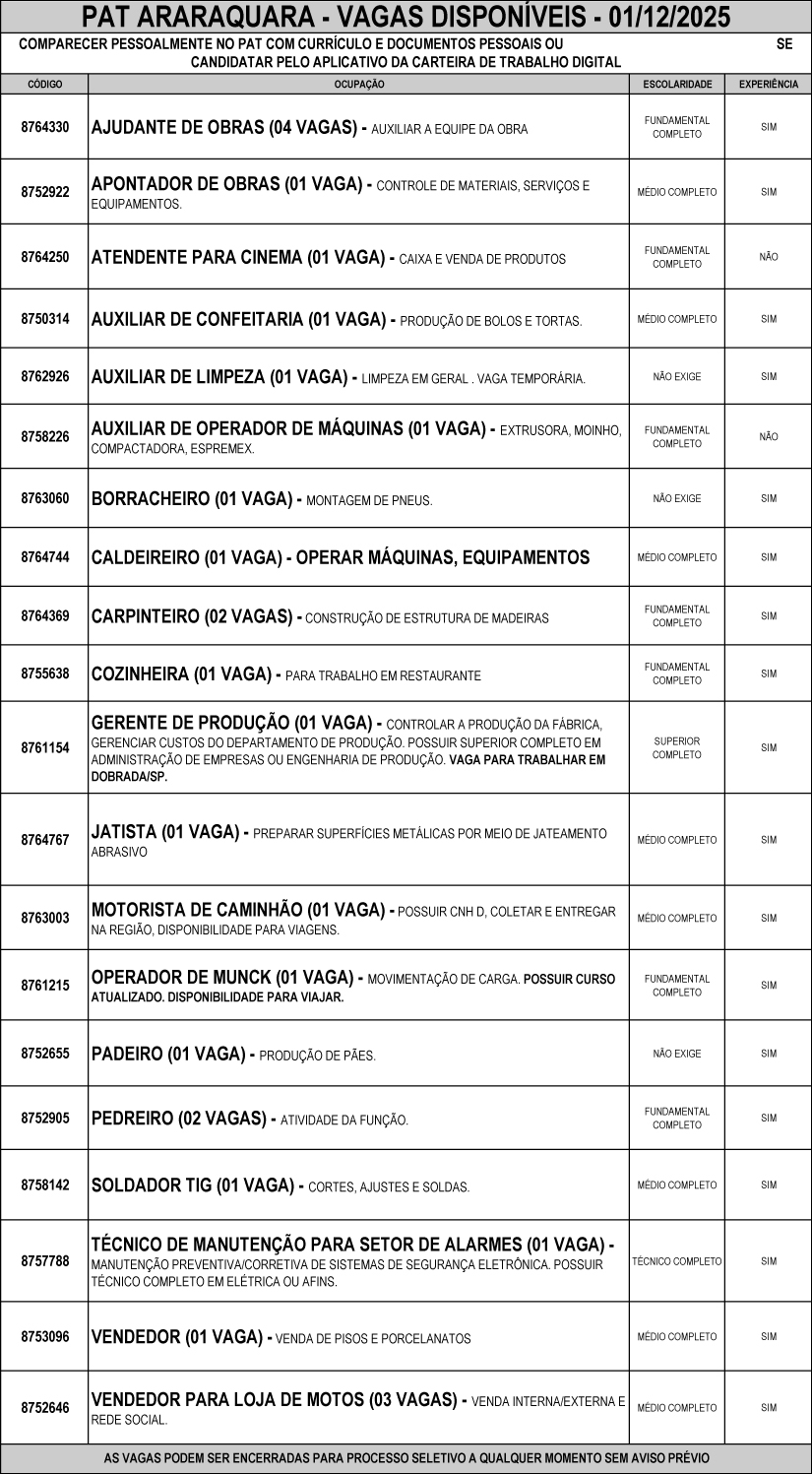 Confira as vagas de emprego disponíveis no PAT de Araraquara